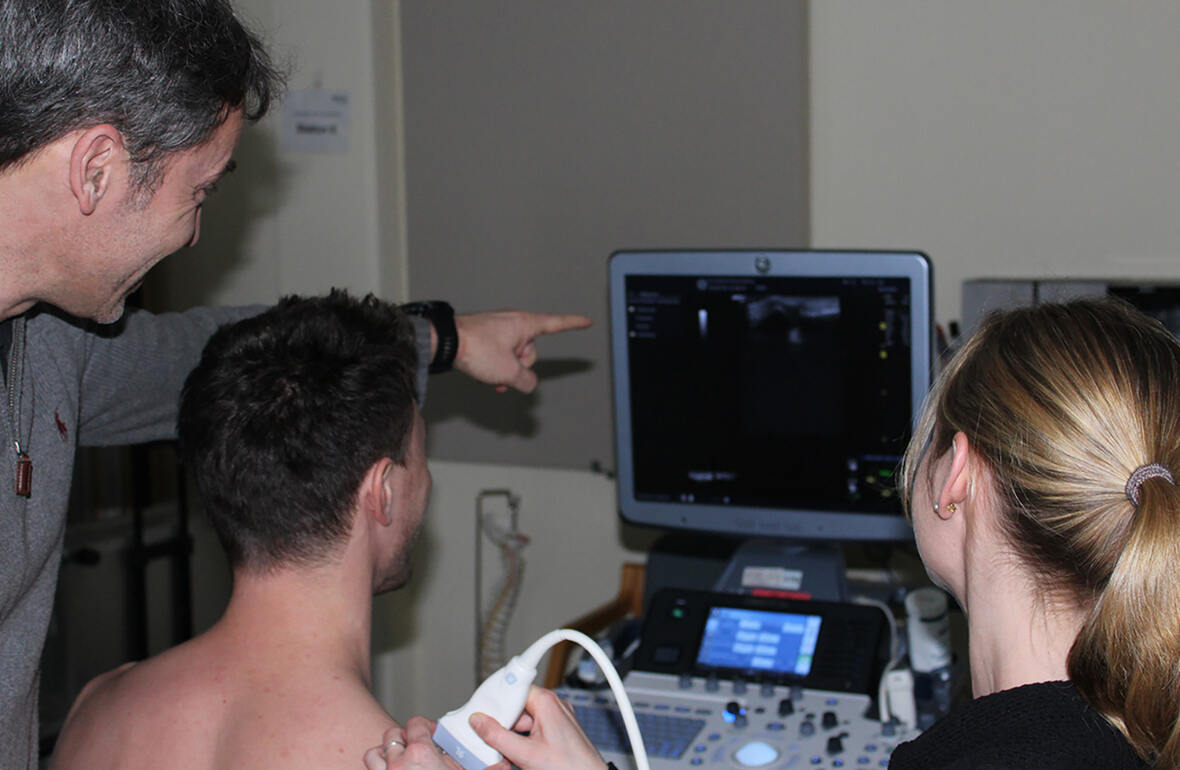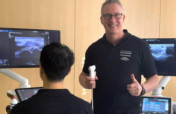 Unser Ziel ist es, jedem/r Kursteilnehmer/in eine hochqualifizierte Ausbildung in der Arthrosonographie (muskuloskelettale Sonographie) an modernen Sonogeräten mit viel Freude und innovativen Erfahrungswerten zukommen zu lassen. Hierfür steht der Name "Enzensberger Arthrosonographie".