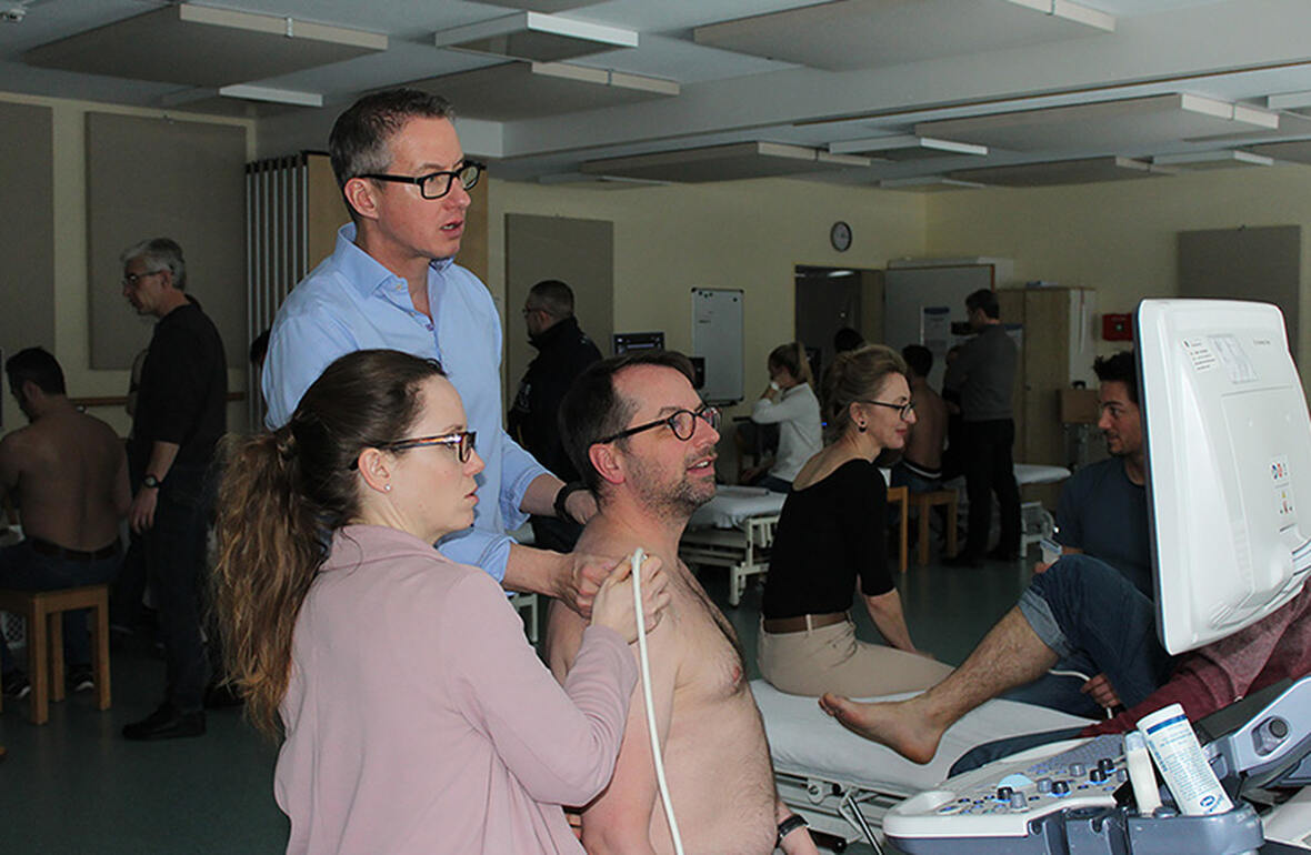 Der Anteil der praktischen Ausbildung "hands on" am Sonogerät beträgt größer 50 Prozent der Kurszeit und erfolgt ausschließlich in Kleingruppen von 3-4 Teilnehmern pro Sonogerät und qualifiziertem Instruktor.